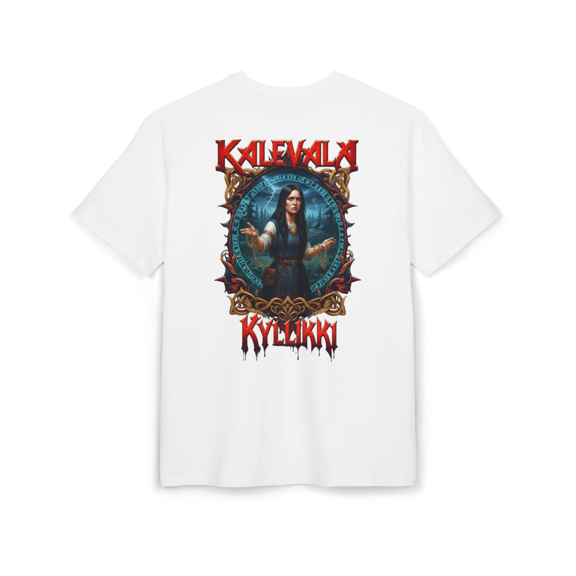 Paita on klassisesti leikattu ja edessä sekä takana on selkeä, voimakas kuva Kyllikistä Kalevalan hengessä. Kuvassa näkyy vahva, rauhallinen mutta päättäväinen hahmo, ympärillä metsän, veden ja runojen motiivit, kuin vanhat tarinat hämärässä illassa. Tää tee herättää keskustelua ja tuo mieleen pitkät kylmät yöt, jolloin tarinat kulki suusta suuhun. Kevyt päällä mutta kestää käyttöä, laskeutuu mukavasti ja painatus pysyy terävänä pesusta toiseen. Sopii keikoille, arkeen tai niihin hetkiin kun haluut kantaa tarinaa mukanas.
