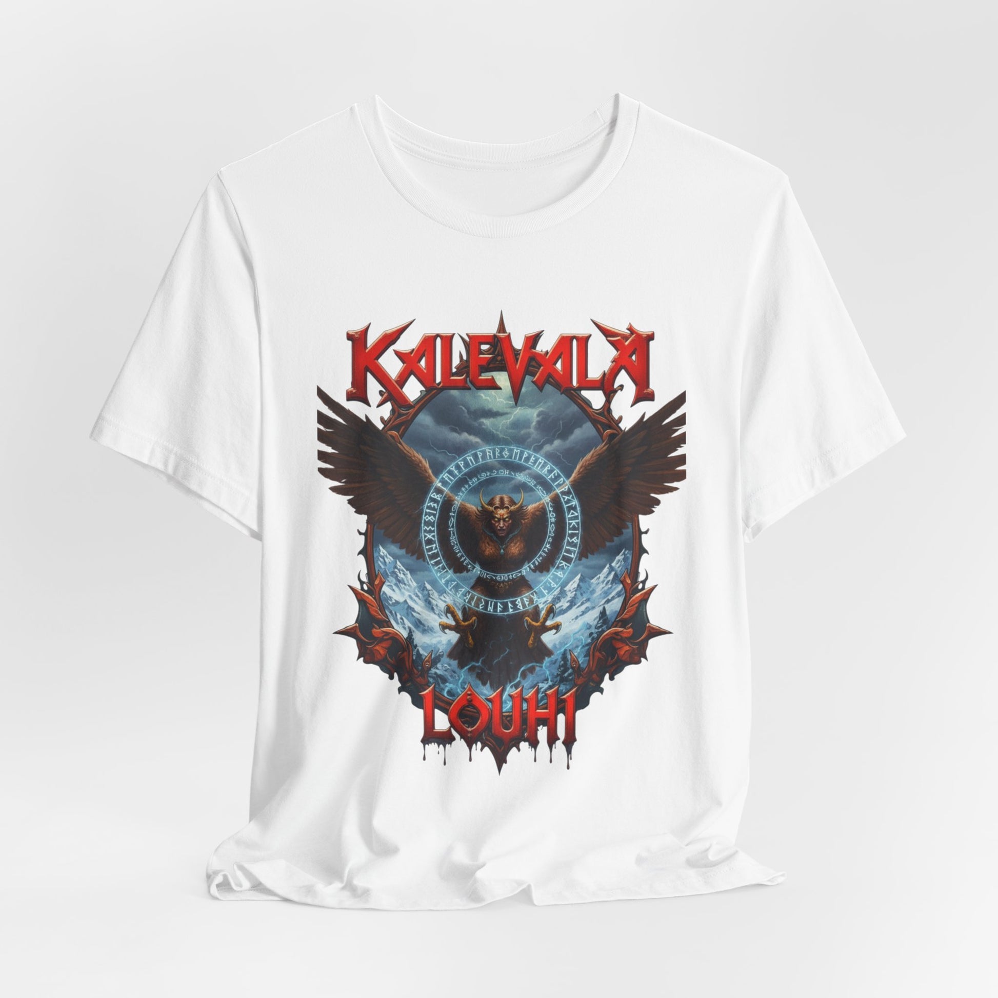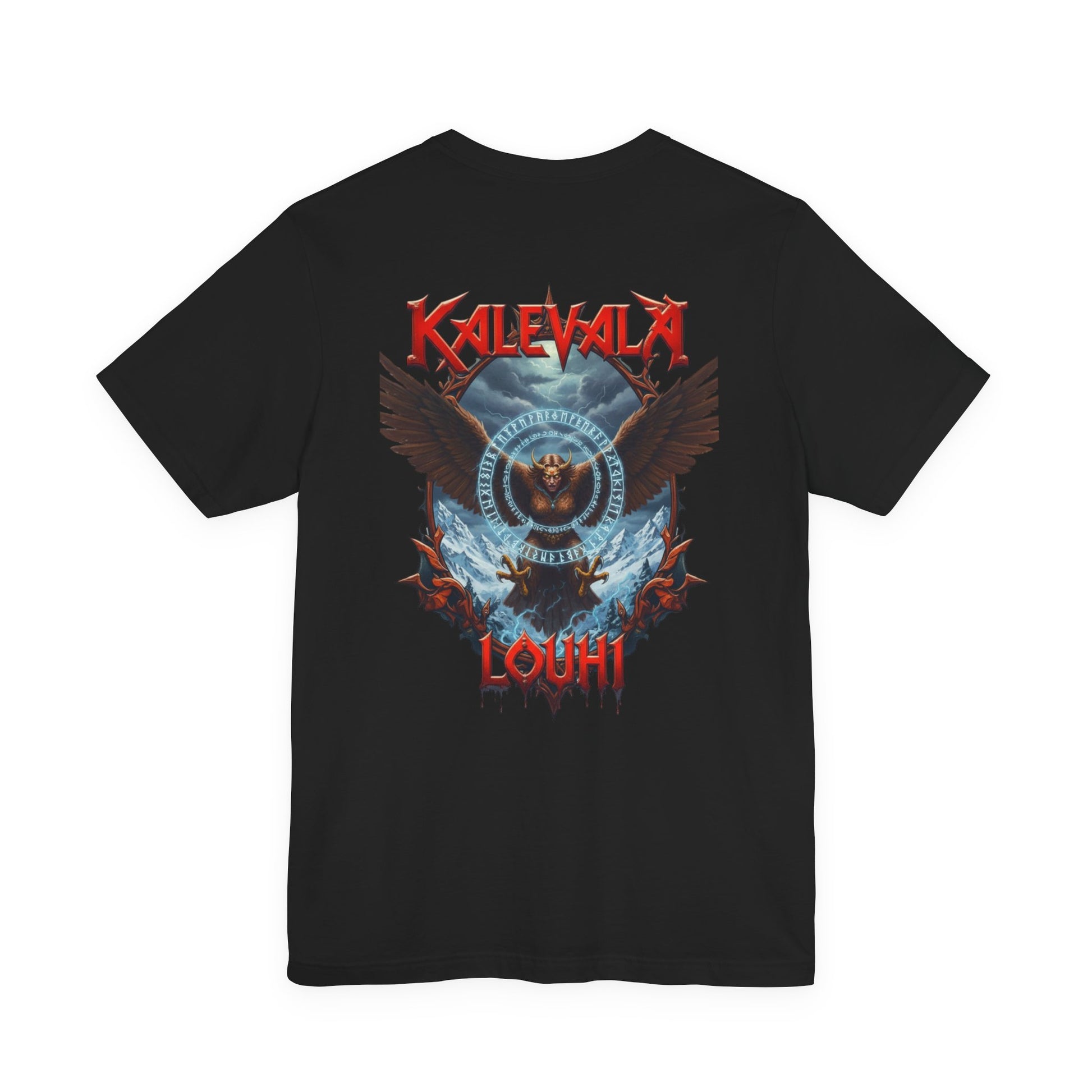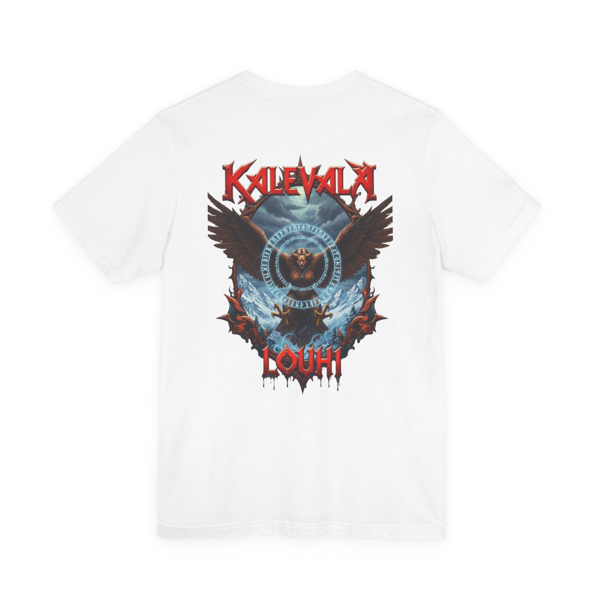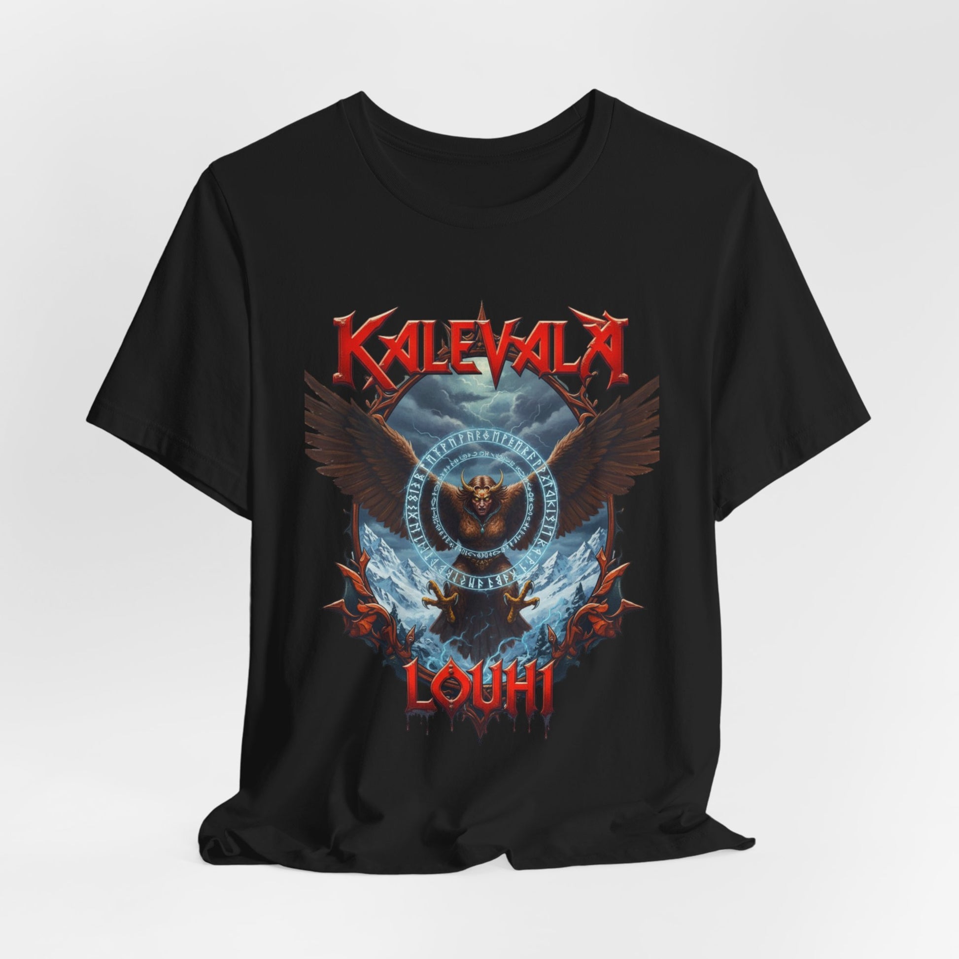 Tää paita kertoo just siitä hetkestä. Klassinen leikkaus ja edessä sekä takana selkeä, voimakas kuva Louhesta kotkana, siivet levällään ja katse teräksenä, suojelemassa sampoa. Kuvituksessa näkyy muinaisen tarun runot, myrskyävä taivas ja Pohjolan kylmä voima, kuin mustien öiden kertomukset jotka jäi mieleen jo nuotion äärellä. Tää tee herättää keskustelua ja palauttaa mieleen pitkät kylmät yöt, jolloin tarinat kohtalosta, vallasta ja taikuudesta kulki suusta suuhun. Kevyt mutta kestävä, laskeutuu päälle mukavasti ja painatus pysyy terävänä pesusta toiseen. Käytä keikoilla, treeneissä tai hiljasina iltoina kun huoneeseen tekee mieli vähän enemmän legendaa.
