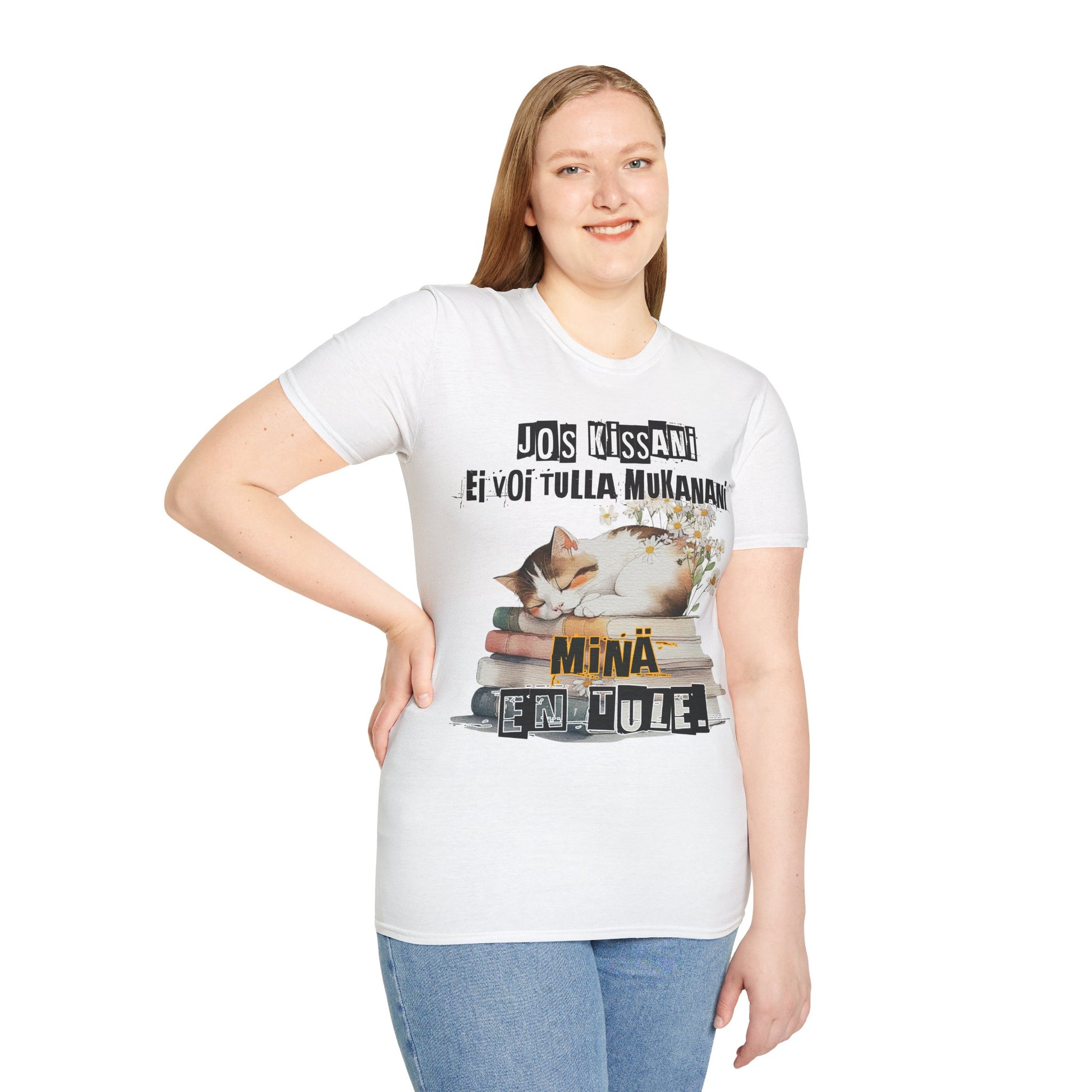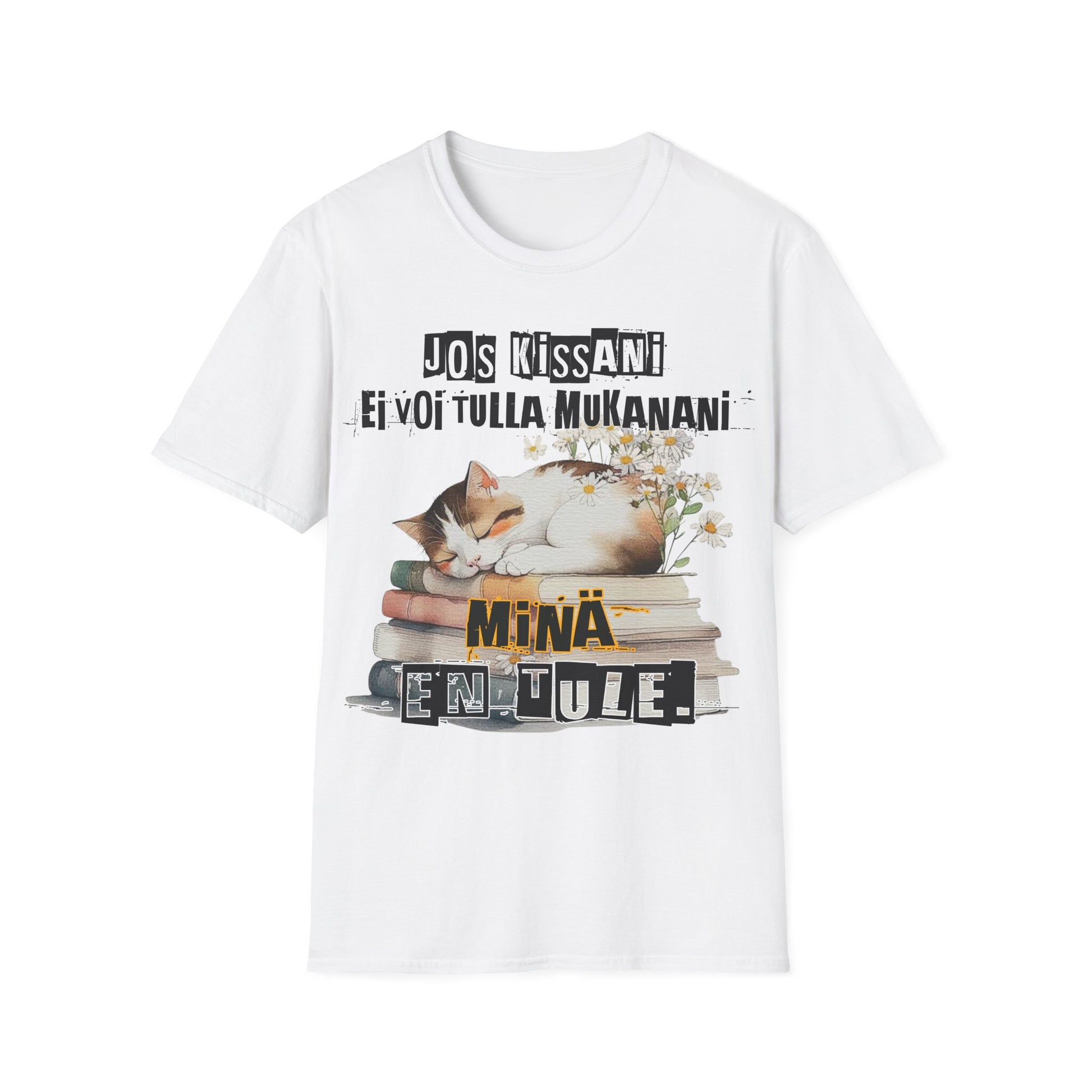 **Pirskatin Pehmee ja Monikäyttönen T-Paita jos kissani ei voi tulla, minä en tule, kissa kirjojen päällä nukkumassa